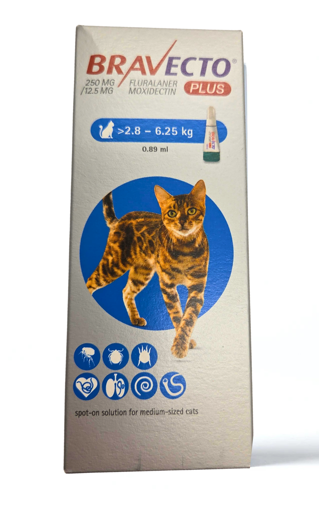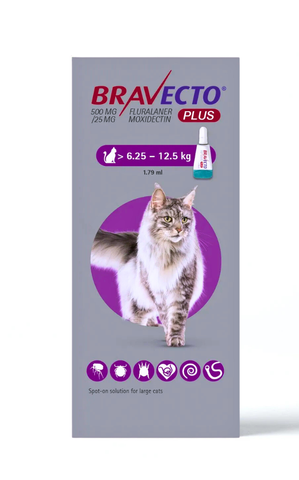 Bravecto Plus Spot-on Solution for Cats is for cats with, or at risk from, mixed parasitic infestations by ticks and fleas, gastrointestinal nematodes or heartworm. Bravecto Plus is exclusively indicated when use against ticks or fleas and one or more of the other target parasites is identified at the same time and provides immediate and persistent flea and tick killing activity for 12 weeks. This product can also be used as part of a treatment strategy for flea allergy dermatitis.